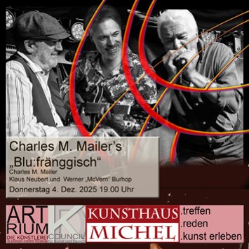Das Charles M. Mailer Trio tritt am Donnerstag, 04.12.2025 ab 19:00h im Kunsthaus Michel, Würzburg auf und präsentiert traditionell einen vorweihnachtlichen „blu:fränggischen“ Bluesabend.